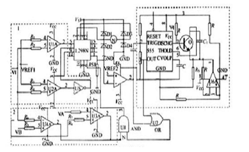 (2)在虛線(xiàn)2的框圖中,兩個(gè)比較器U3A和U4A形成雙極限比較器。當(dāng)VB<vi<va, the="" output="" is="" low.="" when="" vi=""> <vb, the="" output="" is="" high.="" va,="" vb="" upper="" and="" lower="" limits="" of="" <="" span="">爐壓力傳感器轉(zhuǎn)換的電壓,即反應(yīng)堆主體的壓力控制范圍。根據(jù)過(guò)程要求,我們可以指定值只要爐子的壓力在VA和VB之間,就可以達(dá)到VA和VB的水平。電機(jī)停止(注意VB<vrbf1<va, if="" it="" is="" not="" within="" this="" range,="" <="" span="">系統(tǒng)不穩(wěn)定)。