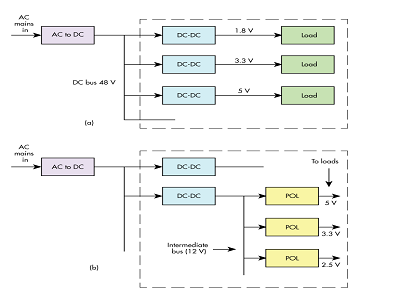 中間總線布置如圖1b所示。交流電源的主直流配電總線連接到每個主要子系統(tǒng)或產(chǎn)生中間總線的印刷電路板(PCB)中的DC-DC轉(zhuǎn)換器。從那里,POL DC-DC轉(zhuǎn)換器接管,為負載創(chuàng)建單獨的電源電壓。