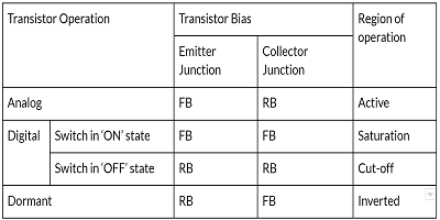 施加到晶體管的兩個(gè)PN結(jié)的偏置會(huì)影響多數(shù)載流子的運(yùn)動(dòng),從而影響晶體管的性能。晶體管在放大器中工作的偏置與基于晶體管的轉(zhuǎn)換器中的偏置完全不同。表1給出了有關(guān)當(dāng)晶體管用作模擬和數(shù)字設(shè)備時(shí)發(fā)射極和集電極結(jié)處的工作范圍和偏置條件的詳細(xì)信息。
